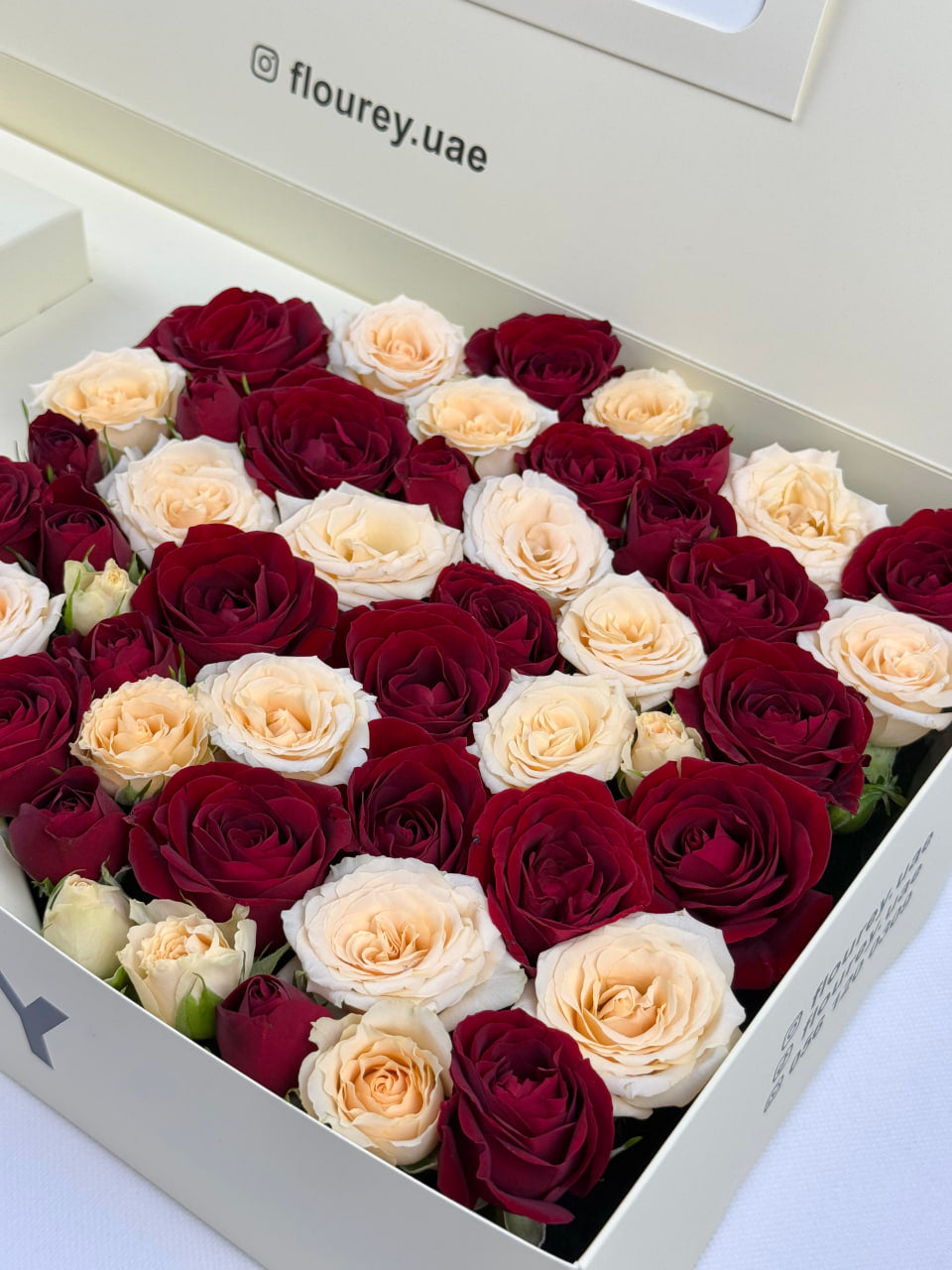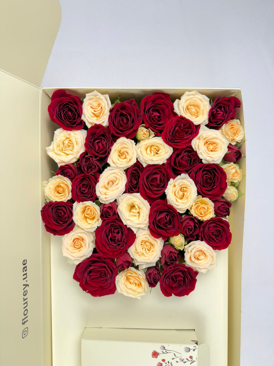 Flourey Beige Box with White and Red Roses