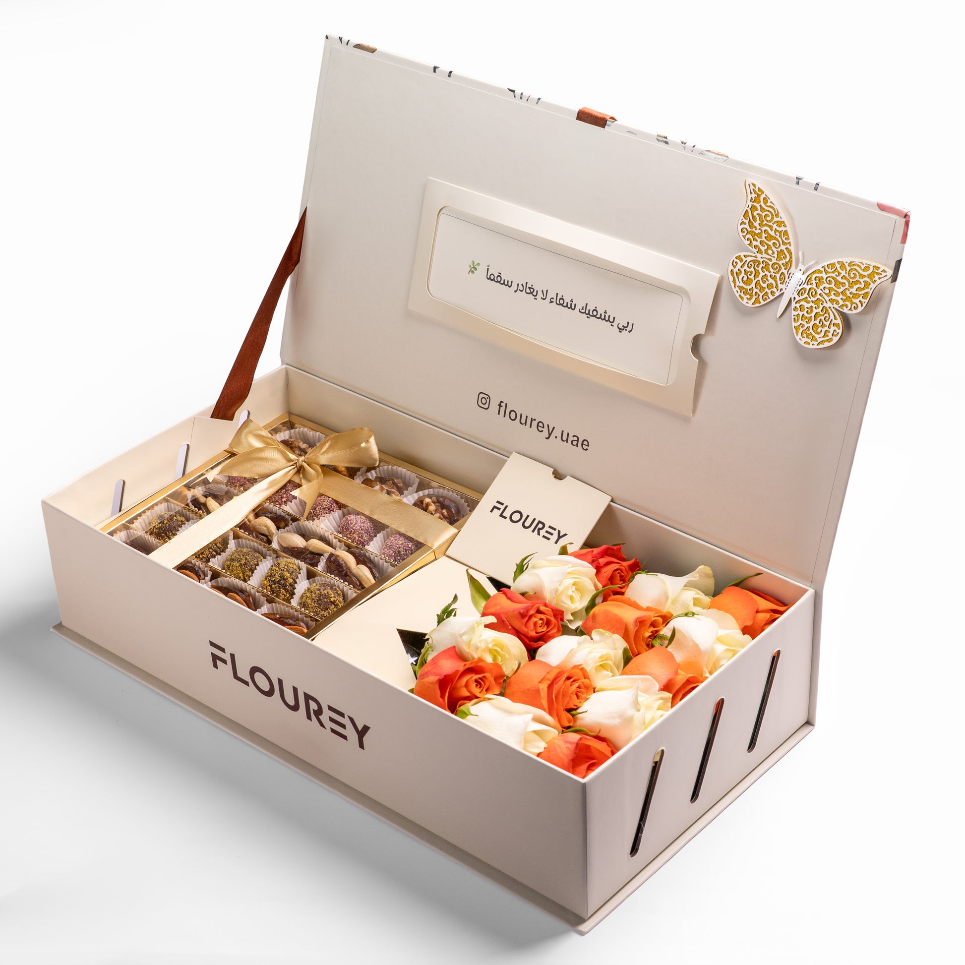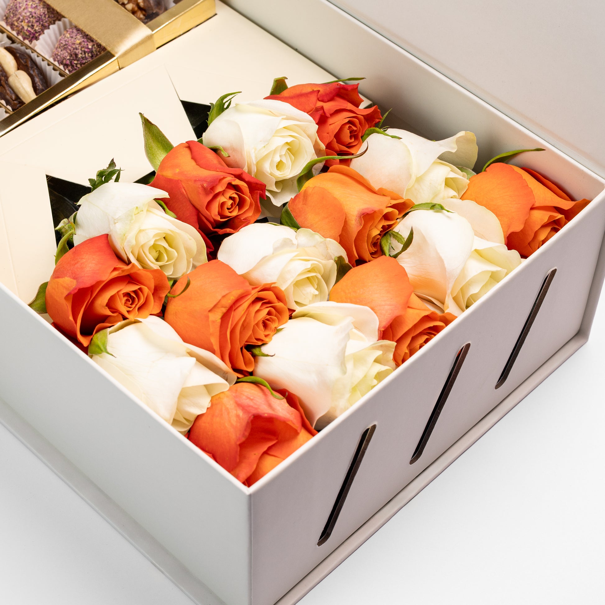 Flourey Box Beige with Orange, white Roses & Gourmet Stuffed Dates