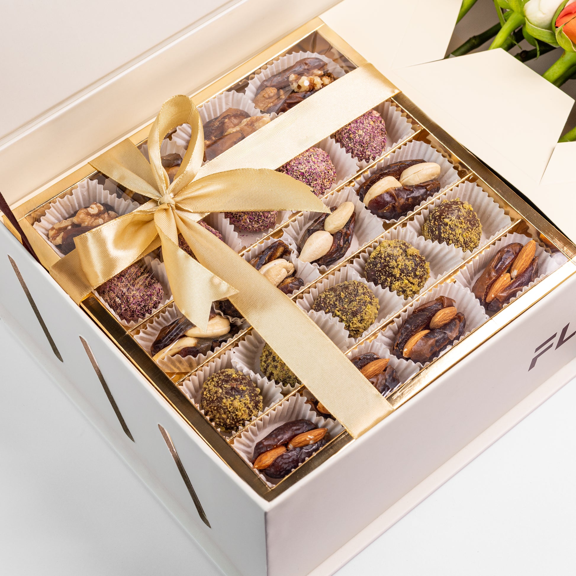 🍫 حلويات فاخرة: أكمل جاذبية الزهور باختيارك من الحلويات الرائعة. اختر الشوكولاتة المخملية الغنية أو امزج التقاليد مع الذوق من خلال الشوكولاتة والتمر. هل تشعر بالمغامرة؟ يمكنك تخصيص المزيد من الخيارات الفاخرة مثل الماكرون أو البسكويت الفاخر، حيث يضيف كل منها طبقة من الفخامة إلى هديتك.