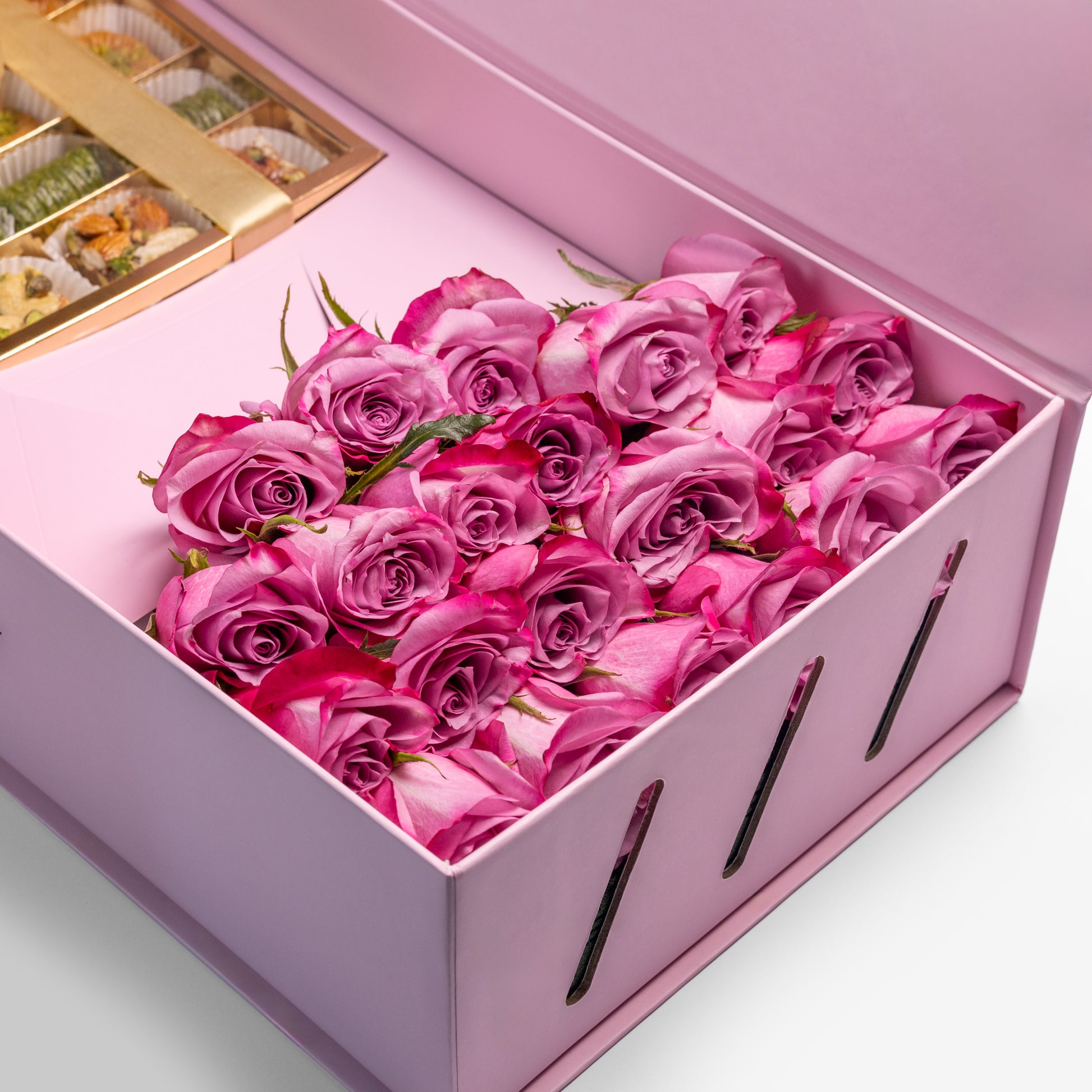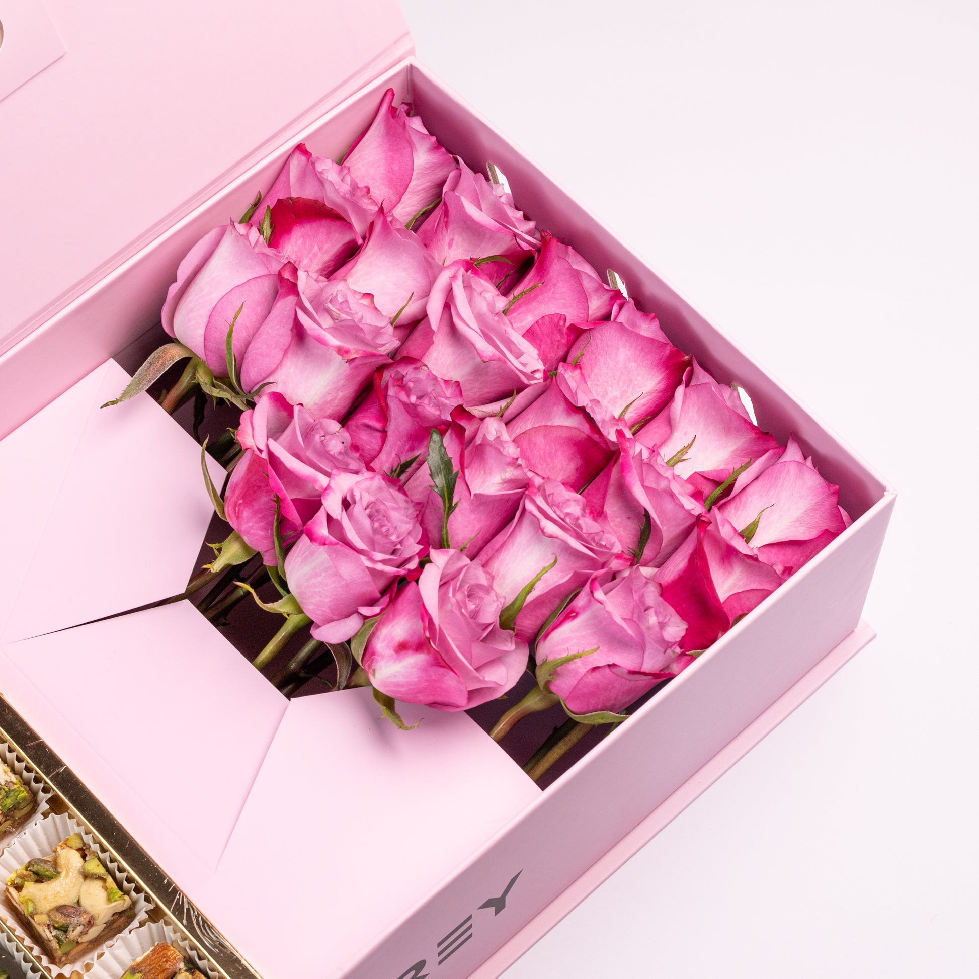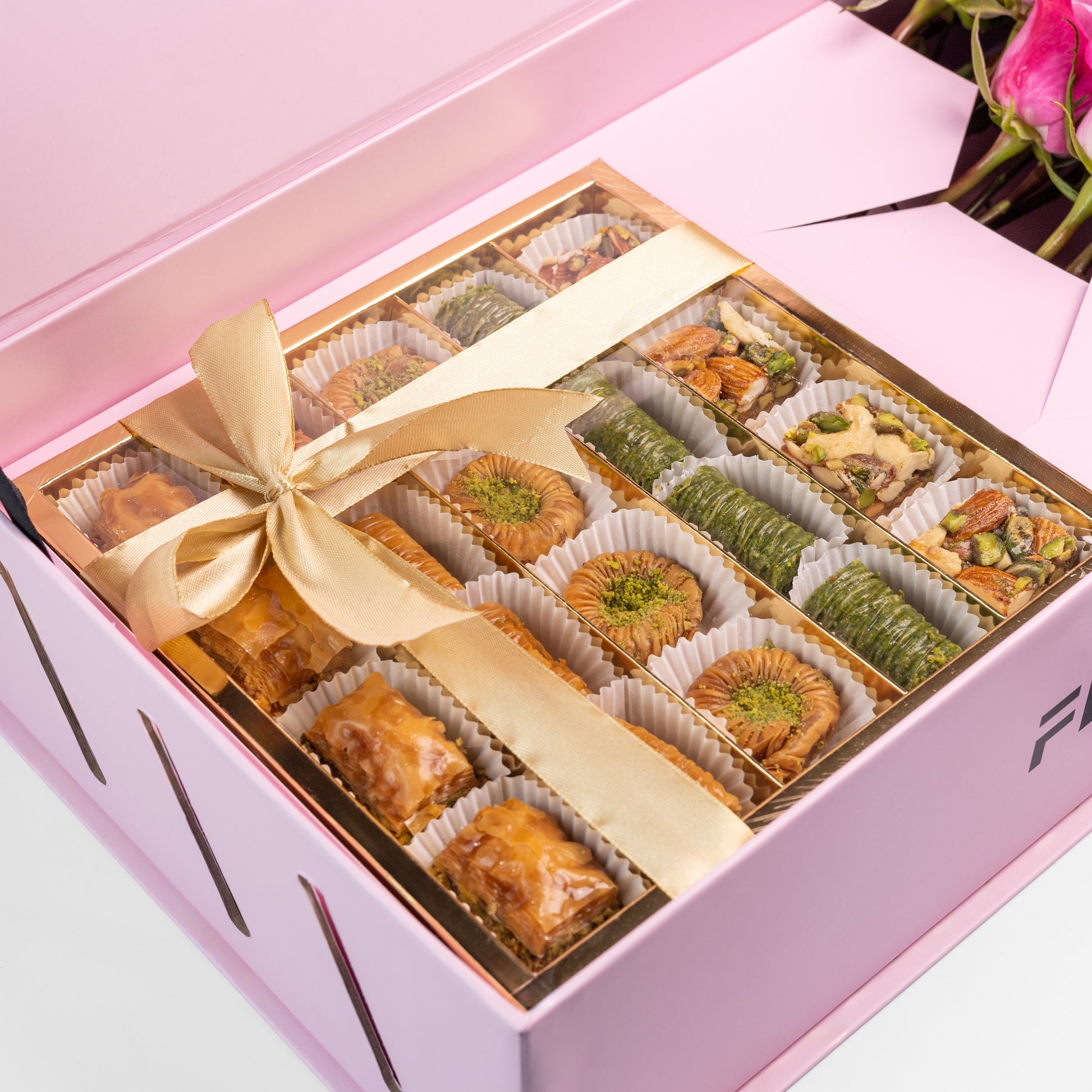 🍫 حلويات فاخرة: أكمل جاذبية الزهور باختيارك من الحلويات الرائعة. اختر الشوكولاتة المخملية الغنية أو امزج التقاليد مع الذوق من خلال الشوكولاتة والتمر. هل تشعر بالمغامرة؟ يمكنك تخصيص المزيد من الخيارات الفاخرة مثل الماكرون أو البسكويت الفاخر، حيث يضيف كل منها طبقة من الفخامة إلى هديتك.