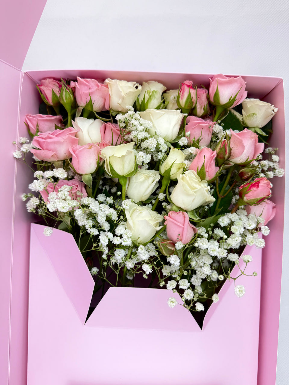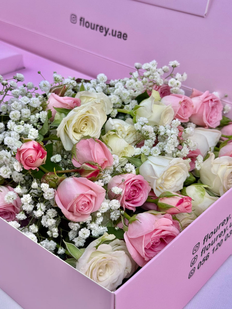 Flourey Pink Box with Pink and White baby roses